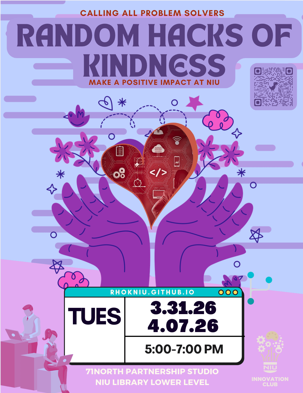 Are you passionate about creating positive change in your community? Do you have innovative ideas that could make a real difference? Join us for Random Hacks of Kindness (RHoK) NIU 2026 where students, faculty, and community members come together to solve real-world challenges faced at Northern Illinois University. In Spring 2026, we are tackling food insecurity at NIU. RHoK NIU will host Clinical Assistant Professor of Nutrition and founder of Huskie Harvest Dr. Nancy Prange, Assistant Director of Edible Campus Laura Fehling, and Dean of Students Dr. Kelly Olson. Organizations like Huskie Harvest, Edible Campus, and the Huskie Food Pantry provide free food to NIU students in need, but like any nonprofit initiative, they faces ongoing challenges such as managing inventory, engaging volunteers, student experience, stigmas, and minimal donations. That's where YOU come in!